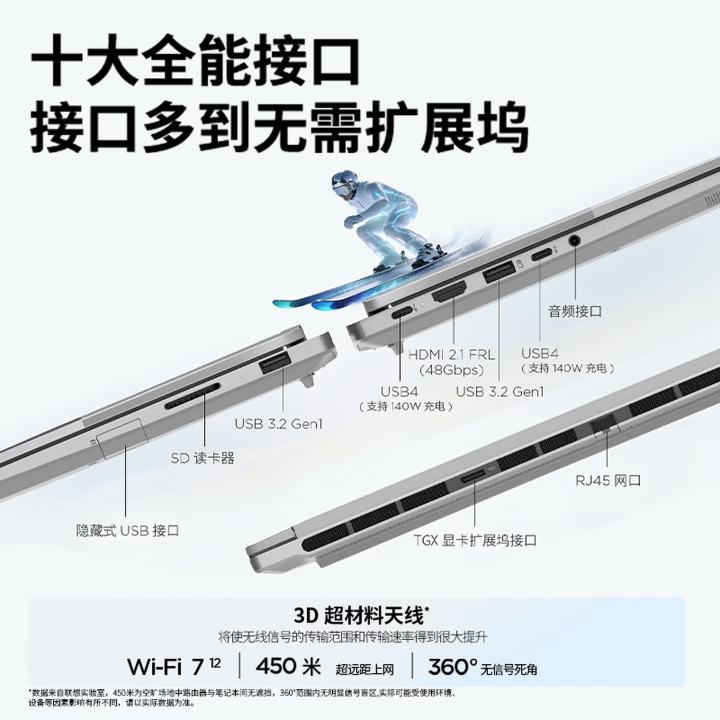 整机作念工上在A/C/D面承袭金属铝材质,A面还带有两种喷砂工艺,援助180°开合。屏幕搭载14.5英寸3K屏幕,分手率可达3072*1920,援助 30Hz-120Hz可变刷新率,散失100% DCI-P3 色域,最高亮度可达500尼特。而况内置99.9Wh大电板,标配140W便携氮化镓电源适配器,30分钟可快充至60%电量。